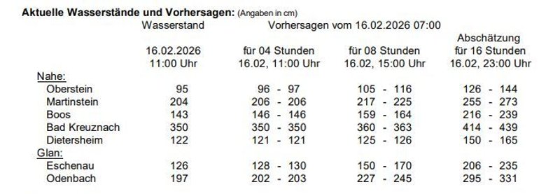 Folgende Meldungen der Hochwasservorhersagezentrale Rheinland-Pfalz für Nahe und Glan liegen derzeit vor (Stand: Montag, 16.02.2026, 11 Uhr):
